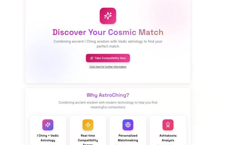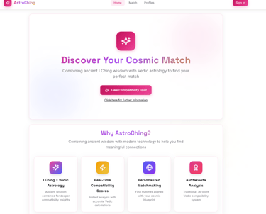 AstroChing is a comprehensive relationship intelligence platform driven by api that employs Vedic Astrology: Precise planetary alignment for cosmic-level compatibility matching and I Ching: Hexagram-based situational compatibility.